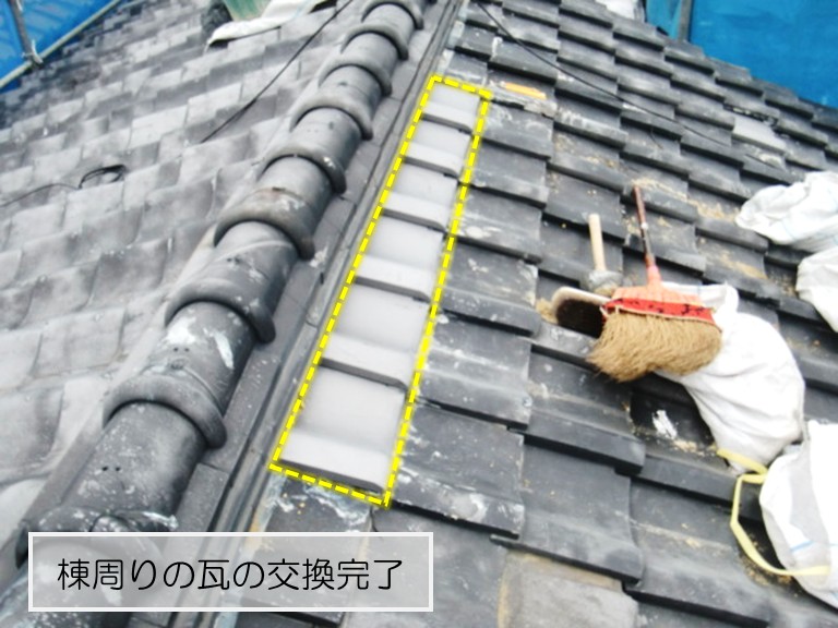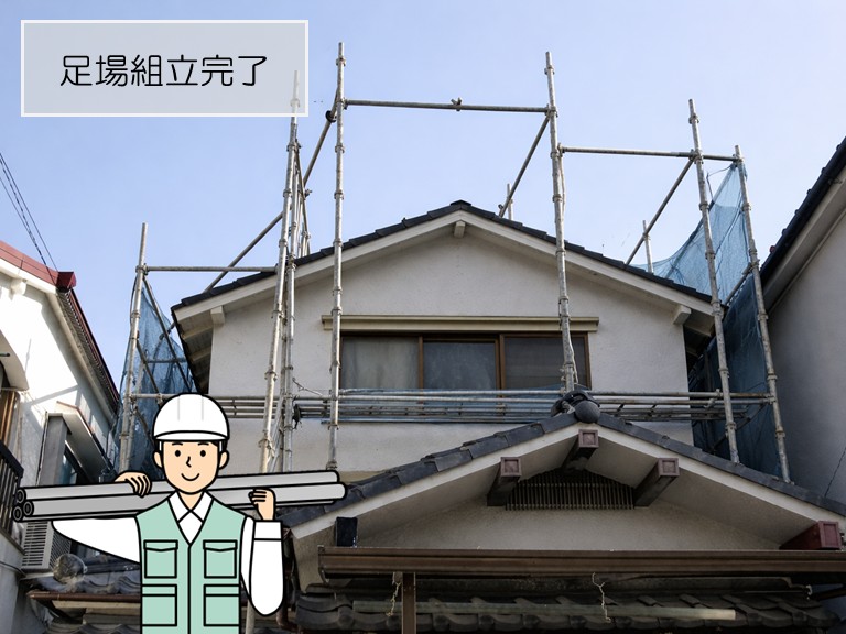 和泉市S様邸で台風による屋根被害の工事をおこなうにあたり、安全に作業を進めるための仮設足場を設置しました。縦柱・踏み台・手すり・梯子を組み合わせた足場に、ホコリや部材の飛散を防ぐメッシュシートを張り、いよいよ屋根工事がスタートします。