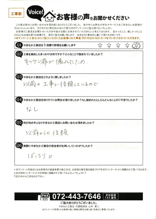泉佐野市でキッチンのシンク下の扉の蝶番交換と水栓入替をしたO様の声