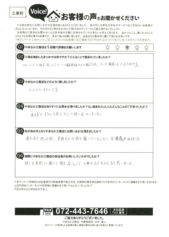フローリングの板が弱ってきて、いつ板が折れるのか心配でした。