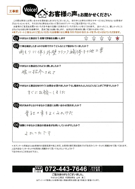 貝塚市で外壁のひび割れにシーリングを充填して雨漏り修繕したN様の声
