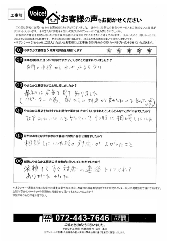熊取町でキッチンの水漏れで水栓の交換を行ったO様の声をご紹介