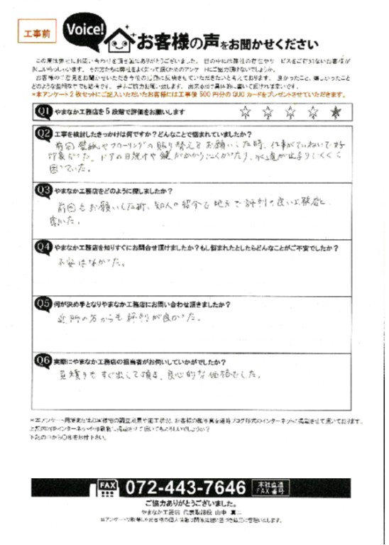 前回の壁紙やフローリングの張替えをお願いした時仕事が丁寧で好印象だった。ドアの日焼けや鍵がかかりにくかったり、水道が止まりにくくて困っていた。