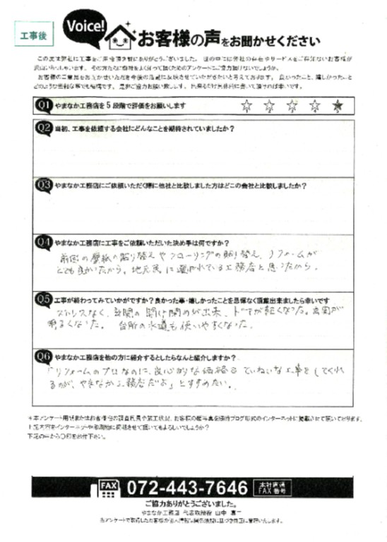 K様より「台所の水道も、玄関ドアも使いやすくなった!!!」とのお喜びの声をいただきました。