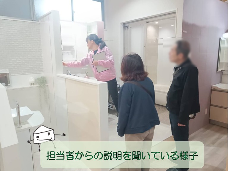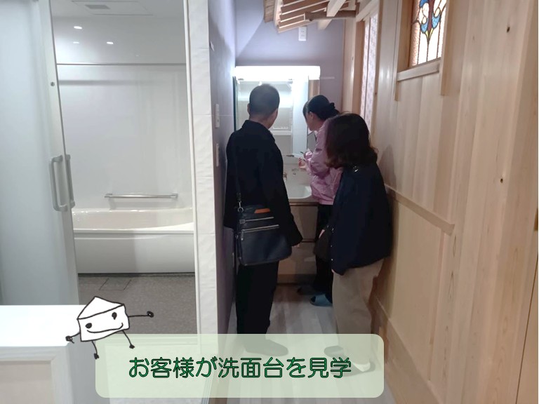 洗面台を見学し、現場担当者より説明を聞かれていますね。