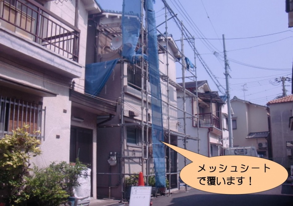 足場を安全に設置したあと、ホコリ等が周りに飛ばないように、メッシュシートで覆い養生します。