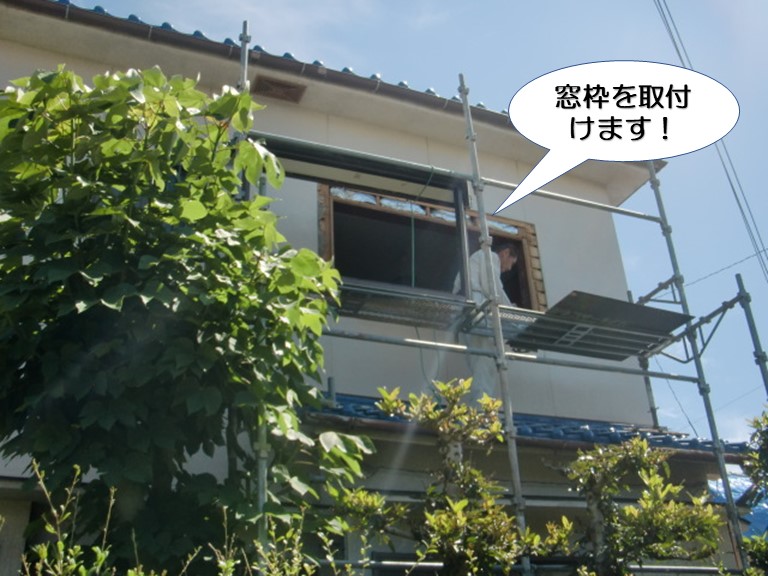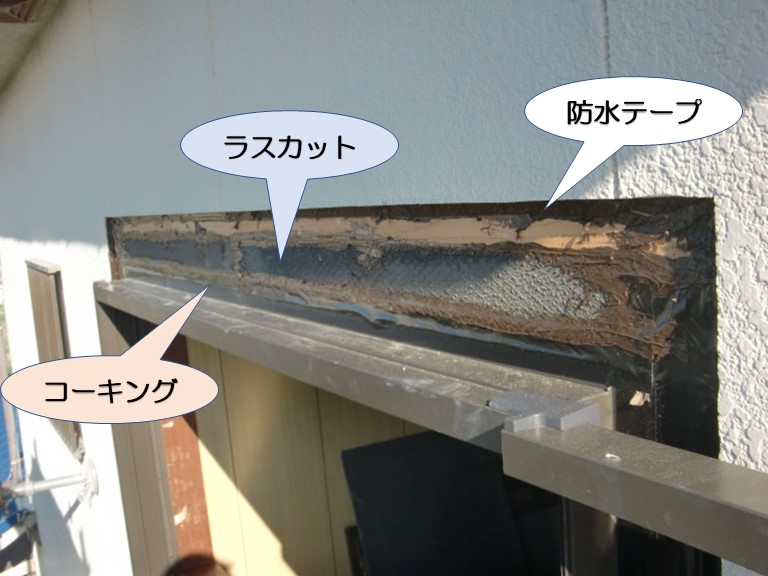 窓枠を取付けて、外壁の木下地にラスカットというモルタルを塗るための下地材を張り、周囲と取り合いに防水テープ、コーキングで防水しました。