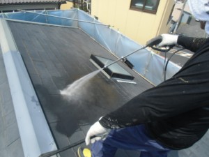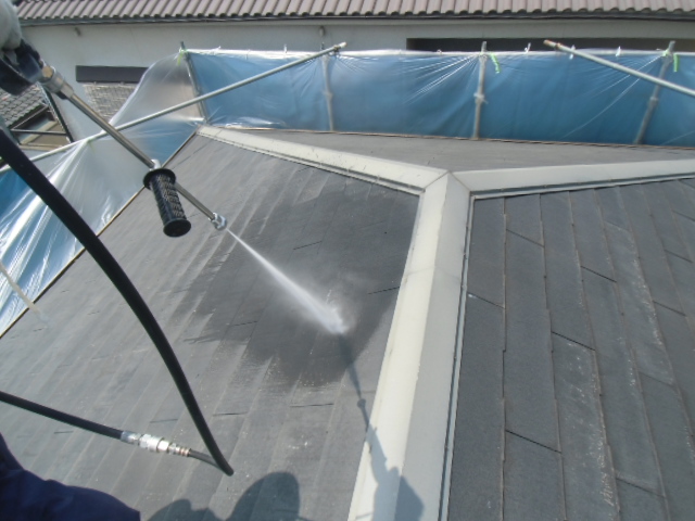 本日は、岸和田市加守町の外壁塗装の4日目、外壁と屋根の高圧洗浄工程です。