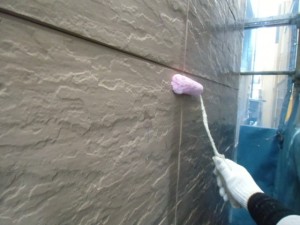 塗装には、「ローラー塗り」と「吹付け」の2種類ありますが、塗る塗料の種類により使い分けします。多彩模様を出す塗料では模様をきれいに出すため「吹付け」で塗装することが多く、今回は単色なので「ローラー」塗りをしています。「ローラー塗り」は実際に塗料を付けて塗るので、しっかりと塗ることが出来ます。