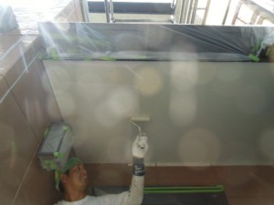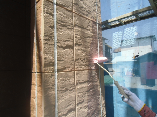 その後、目地にマスキングテープをして新しいシーリングを充填しました。しっかりとした防水工事をし、高圧洗浄してから塗装工程に入っています。