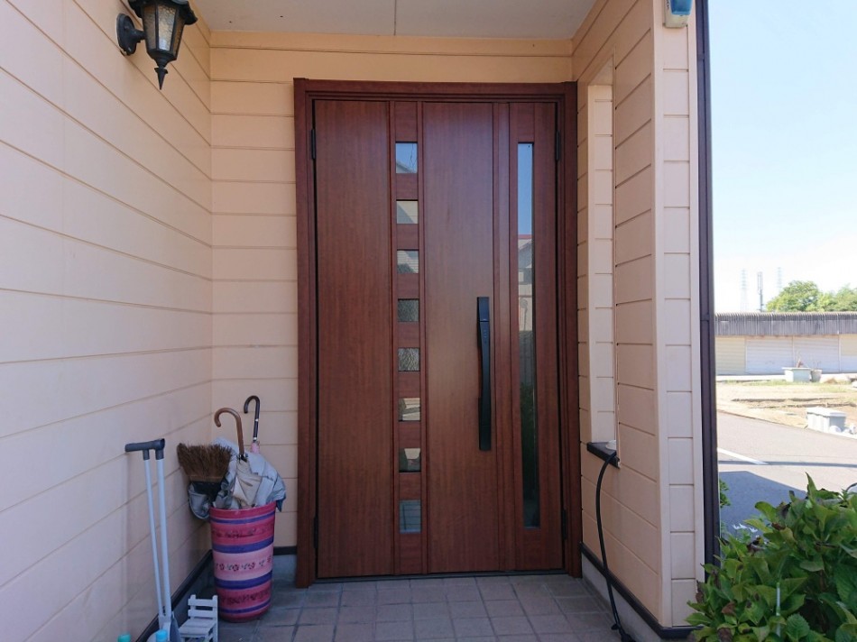 K様邸は以前、やまなか工務店でお風呂や洗面台の入替をしていただいたことがあります。今回のご相談は玄関ドアで、古くなってきたので防犯性の高い玄関ドアへの入替をご検討されていました。採用されたのは、リクシルのリシェント玄関ドア3です。鍵を携帯していると、施錠と開錠がボタン一つでできる機能を搭載!オートロックにも設定できるので鍵の閉め忘れもなく安心です。また、ピッキングの対策で2ロック式になっていて鍵穴がカバーで隠せるSハンドルを採用し、防犯対策が万全の玄関ドアです。また、カギを閉めたまま採風できるので便利で使い勝手がよくなりました。同時に、雨樋のご相談もあり、ベランダに流れる形状になっていた雨樋をベランダの外に回して取付けました。