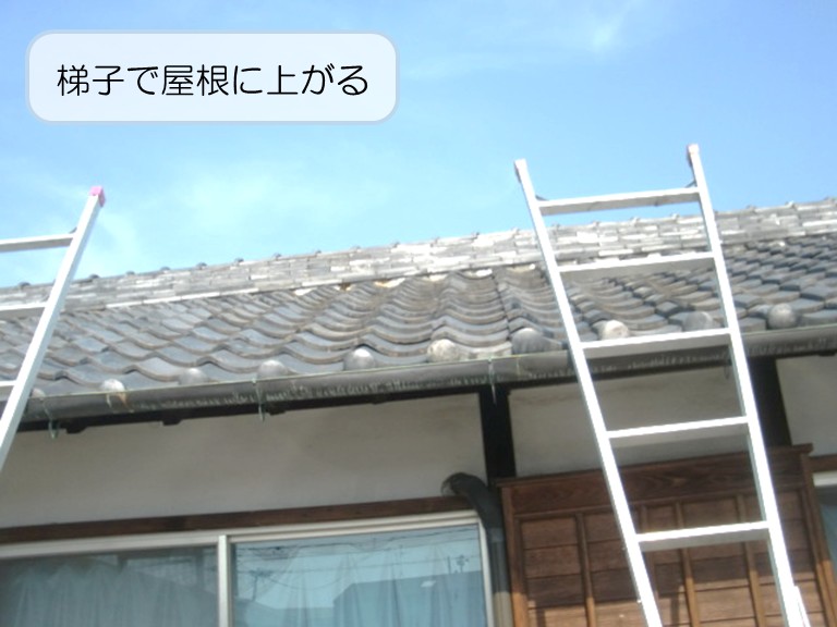 作業員が梯子で屋根に上がり漆喰の詰め替えや、瓦の積み直しなどの作業をします。