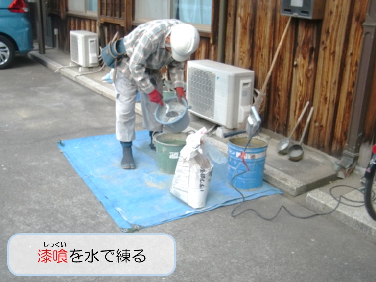 阪南市で暴風雨被害にあったY様邸の門長屋の屋根修理に使う漆喰(しっくい)を練る