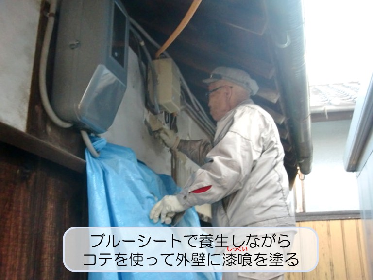 風災にあった阪南市Y様邸の門長屋の外壁を養生をしながら丁寧に漆喰を塗ります