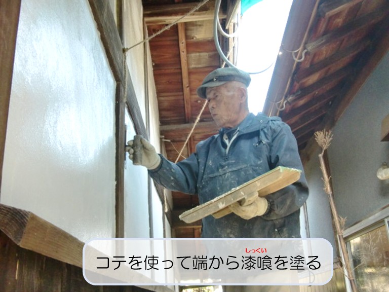 風災にあった阪南市Y様邸の門長屋の外壁の端から丁寧に漆喰を塗り広げます