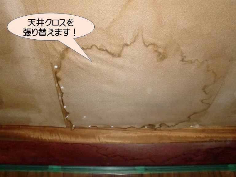 写真は洋室の天井で、長年の雨漏りで天井に水が回り、クロスがめくれてきていたのを鋲で留めて応急処置されていました。