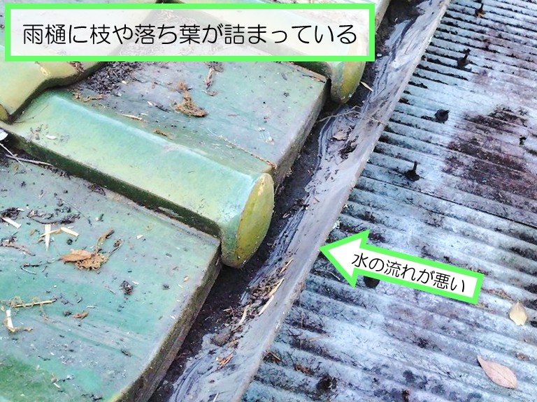 雨樋に枝や落ち葉が詰まっている状態