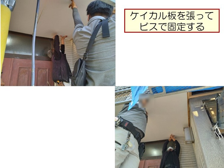 和泉市K様邸の玄関外の軒天井に貼ったケイカル板を塗装します。