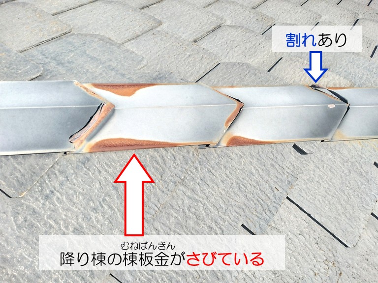 棟板金というのは屋根のてっぺんを覆っている金属製の部品で、雨の入り込みを防ぐ大事な部分です。