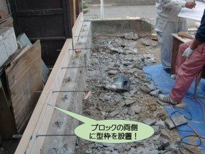 既存の基礎ブロックの両側に型枠を建ててその内側にコンクリートを流し込んで丈夫な基礎を設置します。