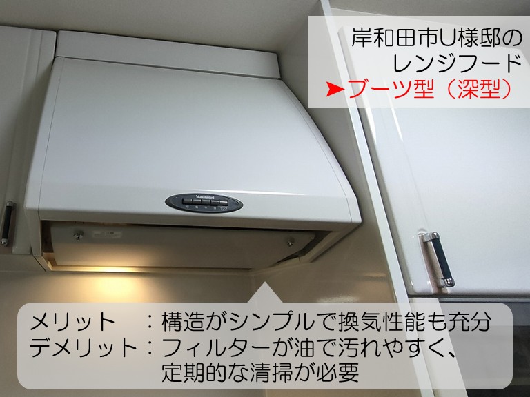 岸和田市U様邸のレンジフードは、ブーツ型(または深型)と呼ばれるタイプでした。