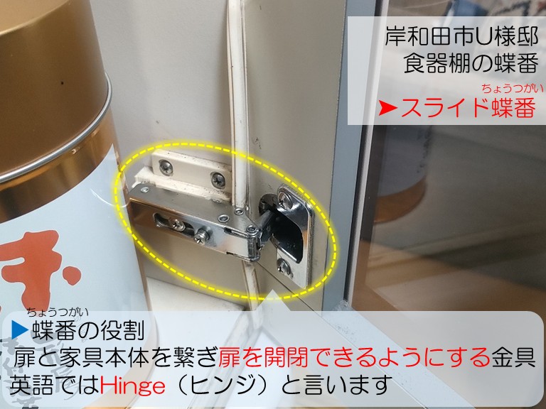 岸和田市U様邸の食器棚の蝶番は古くなっていたので、新しいものに一式交換させていただくことになりました。