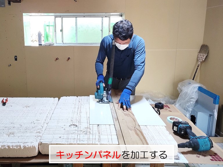 まず、岸和田市 K様邸の設置個所に合わせて、キッチンパネルを加工します。