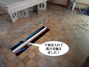 間仕切り壁の下にある敷居も撤去したので隙間ができました。この上に下地を設置してフローリングを張るのですが、先に角材を入れて隙間部分を補強しました。