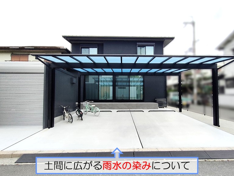 新築住宅に設置されたカーポートの雨樋が短く、屋根から流れ落ちる雨水がそのまま土間に当たり、じわじわと雨水の染みが広がっていたんです。