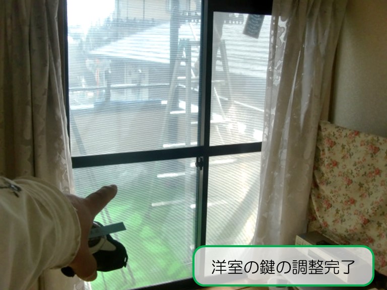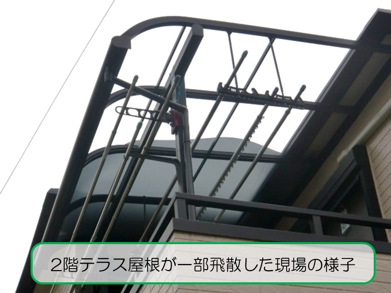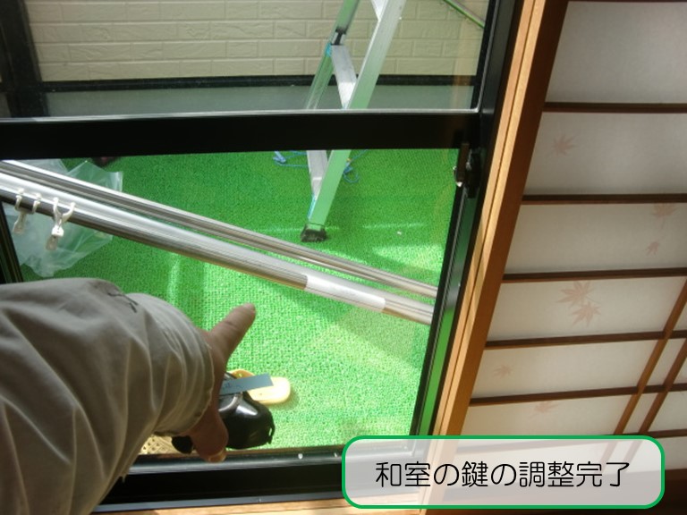 熊取町の2階建てでテラス屋根の台風被害修理と窓の鍵の調整工事