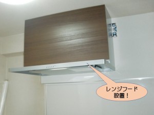 M様邸はL型のキッチンで、レンジフードと吊戸棚の間に隙間ができます。その隙間にお手入れしやすいキッチンパネルを張ります。先にパネルを張ってからレンジフードを設置することで、レンジフードの下の部分も気異例に仕上がります。