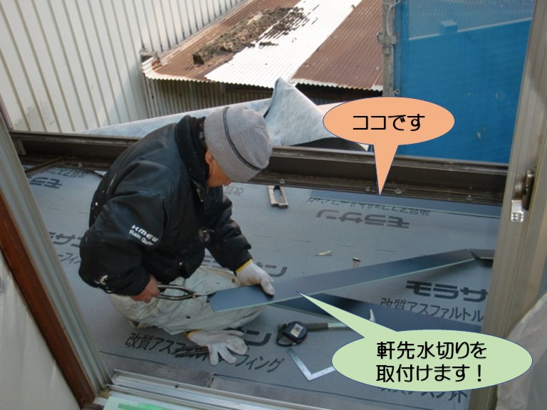 まず、屋根材と同じガルバリウム鋼板を加工し、軒先に水切りを取付けます。