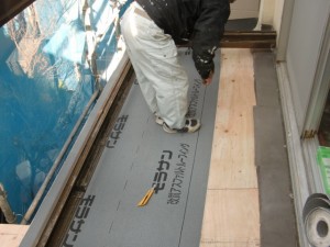 岸和田市の屋根葺き替え・塗装・外壁塗装、サッシの入替などの工事で前日、ベランダの下の下屋の屋根材を撤去し、下地→断熱材→下地→ルーフィング敷きの順番で施工完了しました。