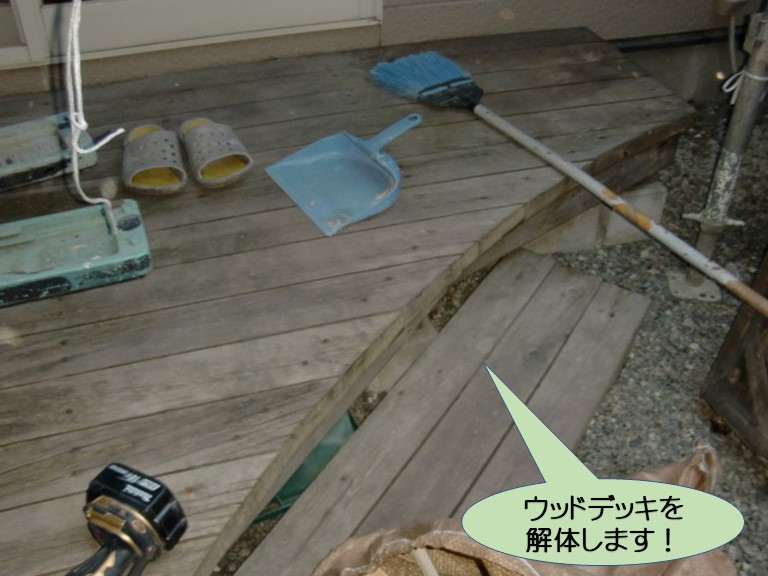 家の裏にある木製のウッドデッキを、耐久性のある樹脂製に入替えることになったので、既存のデッキを撤去しています。