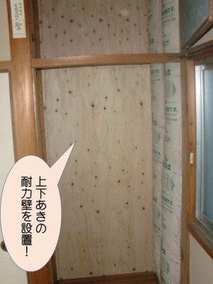 今回の工事で、二階の和室の押入れ上部に小梁を入れて補強し、押入れ正面の壁を上下あきの耐力壁に改修しました。