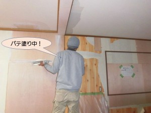 既存のクロスをめくり、下地の目地などにパテ(補修材)を塗り表面を平らにしています。