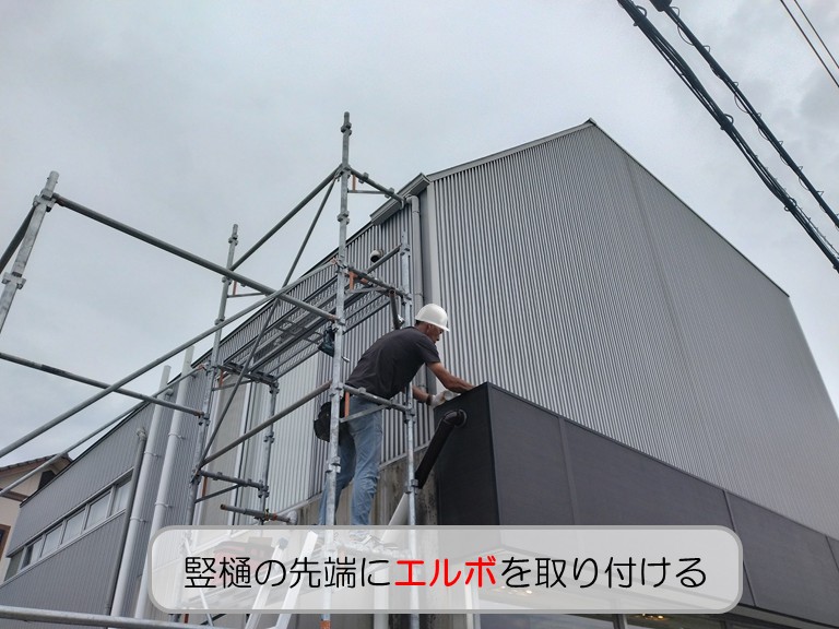 泉北郡忠岡町の店舗付き住宅の竪樋の先にエルボを取り付ける