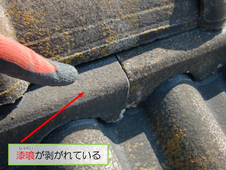 泉南市のY様邸で屋根の棟と平瓦の接合部分の漆喰(しっくい)が剥がれているのを確認いたしました。