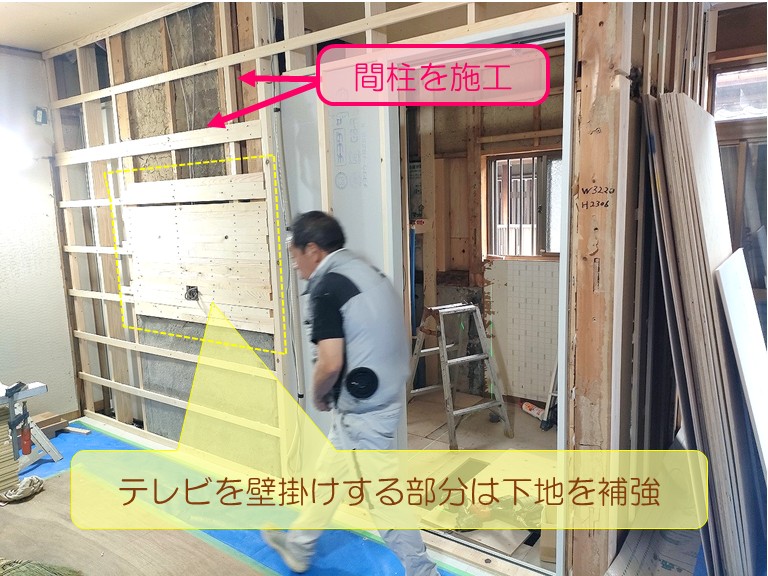 特に、テレビを壁掛けにする部分は強度が必要なため、下地を補強してから石膏ボードを貼ります。