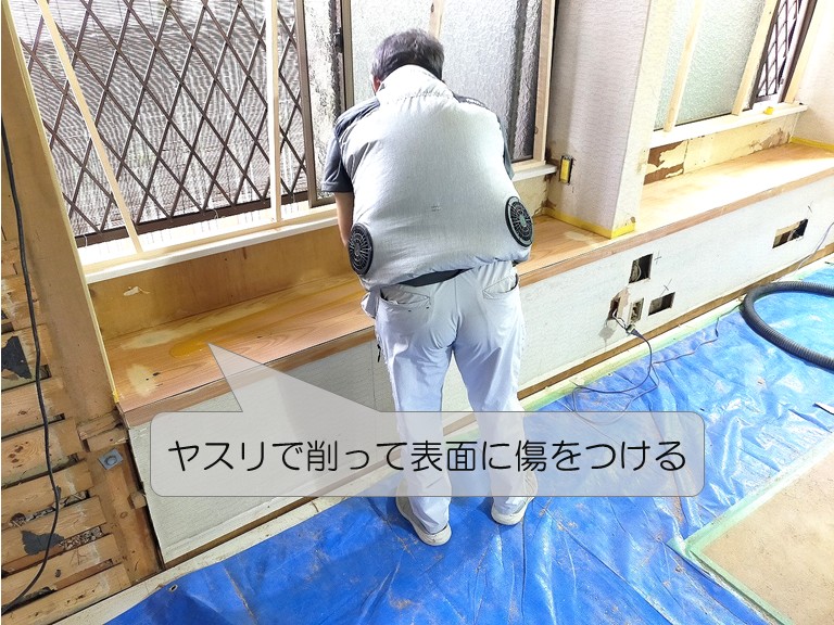化粧板をしっかり接着できるように、既存のカウンター表面にはヤスリで細かい傷をつけ、接着剤がなじみやすいように下処理を行います。