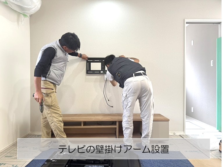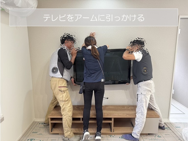 あらかじめ決めていた設置位置に、壁掛けアーム用の下地を取り付けます。下地がしっかり設置できたら、テレビ本体をアームに掛けます。
