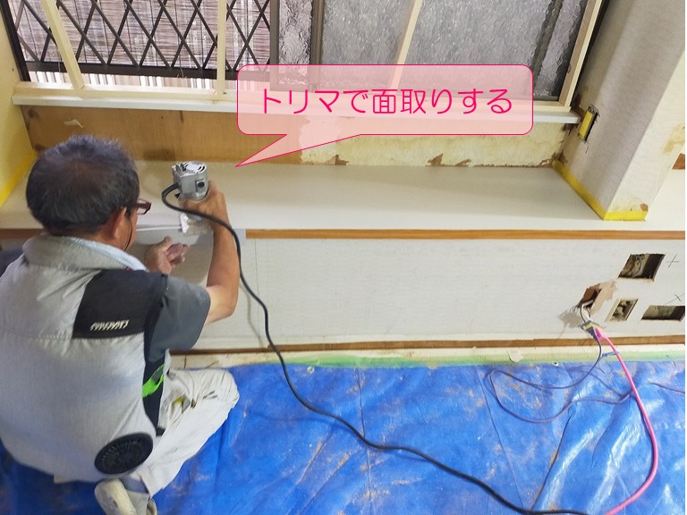 接着後、角になる部分はトリマという専用の工具を使って面取り加工を行いました。