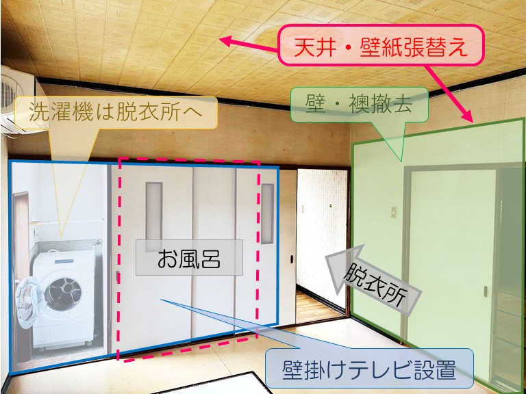 ①脱衣所とお風呂へ通じる両方の扉を撤去し、右側の扉のみを残す。