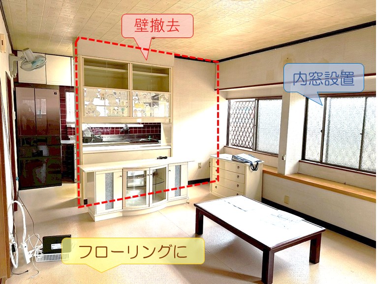⑥キッチンとの間の壁及び、食器棚を撤去