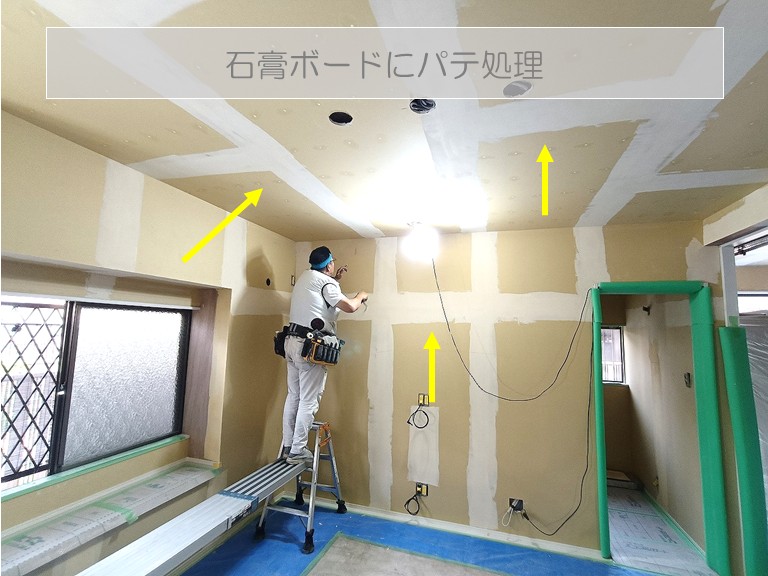 このまま壁紙を貼ってしまうと継ぎ目が目立ち、仕上がりに筋ができてしまうため、隙間を埋める「パテ処理」を行います。