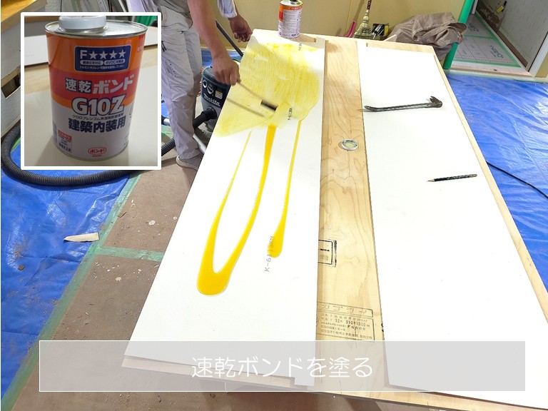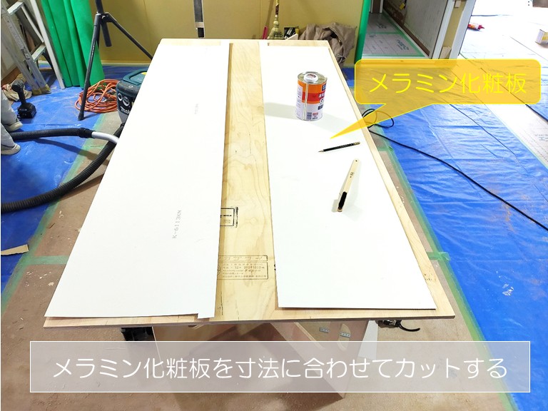 また、カウンターの形状にぴったり合うように、メラミン化粧板も事前に寸法を測り、必要な大きさにカットして準備しておきます。
