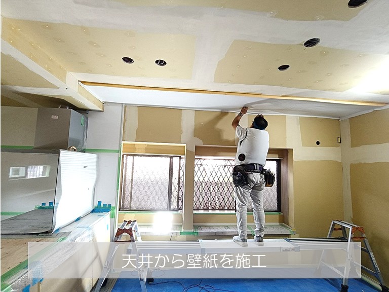 パテが乾いたら、いよいよ天井からクロスを貼っていきます。