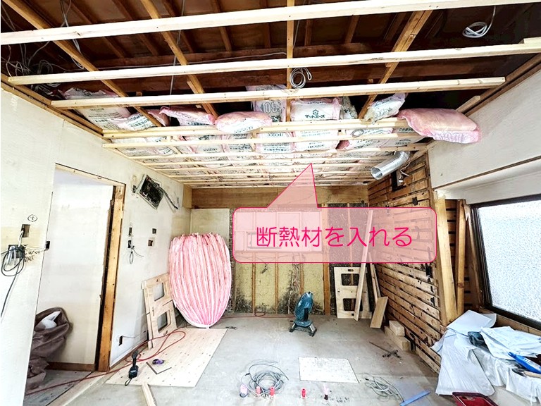 配線工事が完了したら、続いて断熱材を敷き詰めていきます。