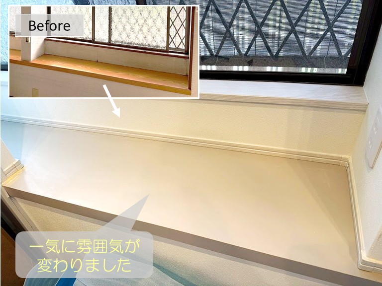 出窓のカウンター部分も、リフォーム後のリビングの雰囲気に合わせて、メラミン化粧板を貼り替えて色を変えていきます。