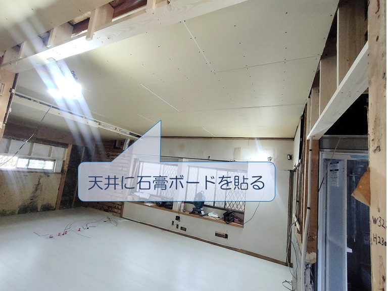天井の下地と電気配線が整ったら、次に石膏ボードを貼っていきます。
