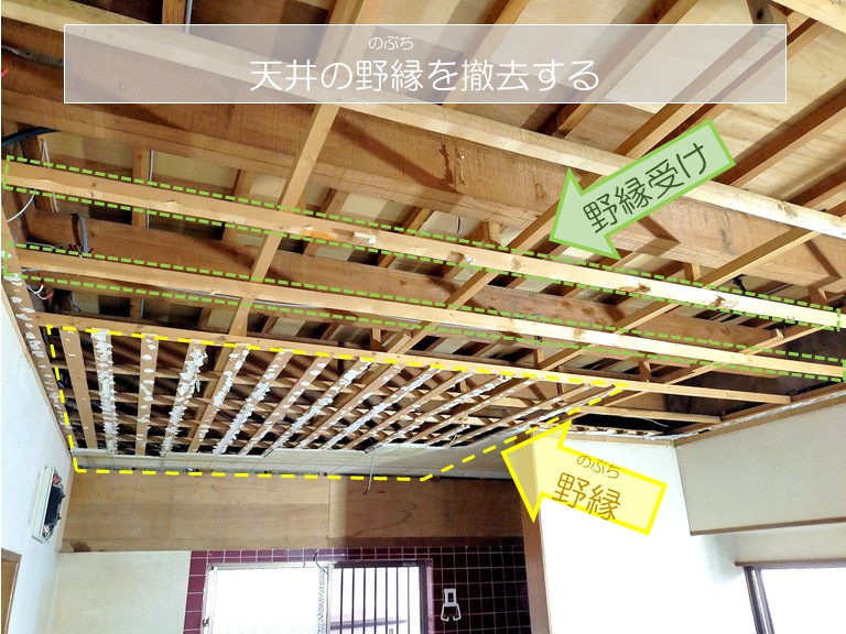 そのため、M様邸の天井にも断熱材は入っていませんでしたが、今回のリフォームではしっかりと断熱材を施工するため、既存の野縁を撤去していきます。
